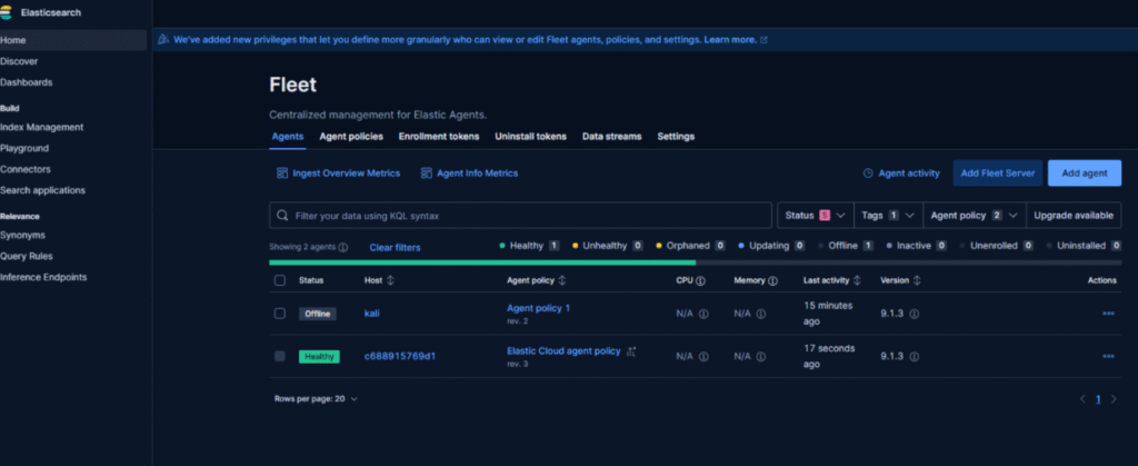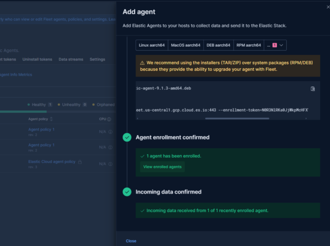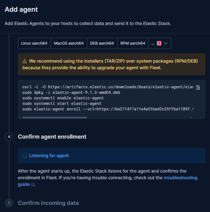 3. Setting up the Agent to Collect Logs. In the Elastic Cloud console, follow the instructions to download and install the Elastic Agent on the Ubuntu VM.