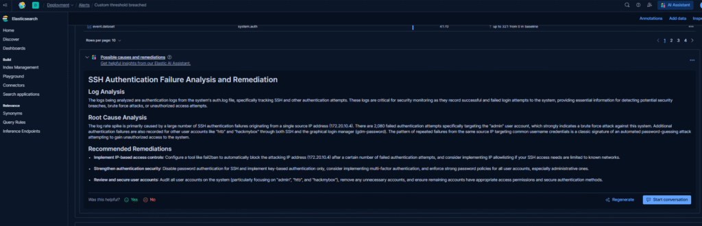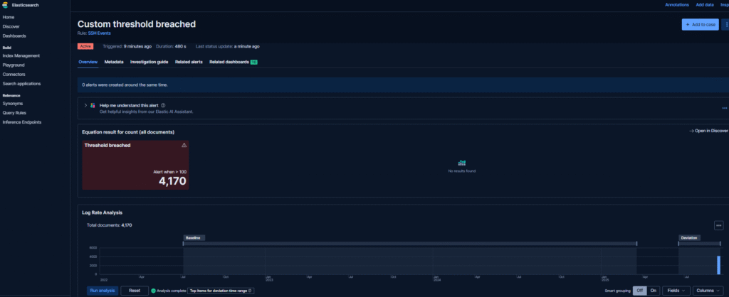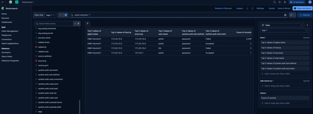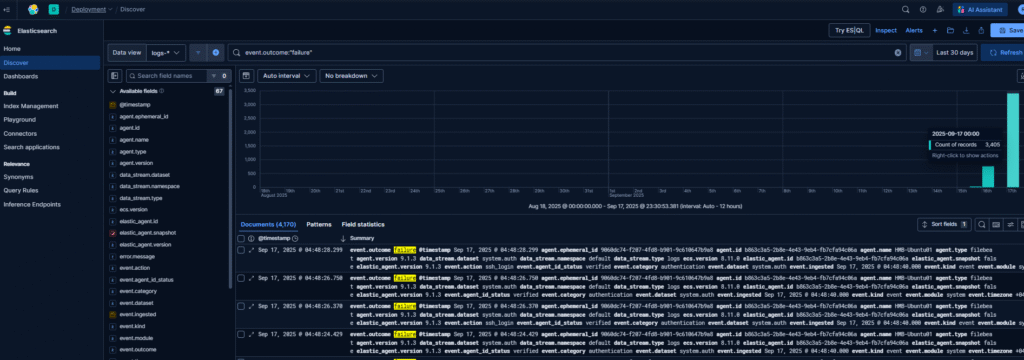 5. Query for security events in Elastic SIEM. In Kibana (the Elastic UI), open the Security (SIEM) app or Discover page and query the indices where the agent is sending logs. Use filters and queries to locate events generated by your Metasploit activity. event.outcome:"failure"