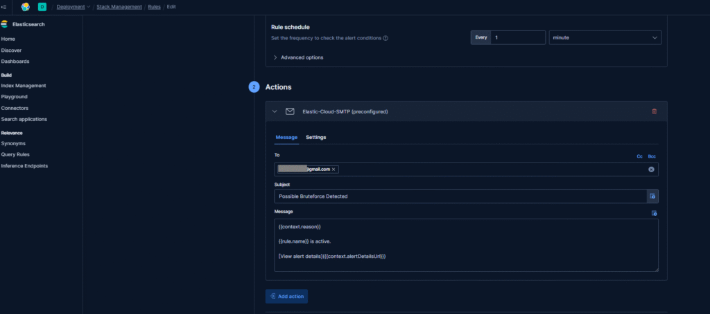8.  Configure Actions. Under  Actions, click Add action. Fill in with email etc.
