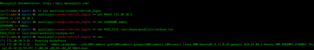 4. From the Parrot machine, run Metasploit against the Ubuntu VM to produce security-relevant events.